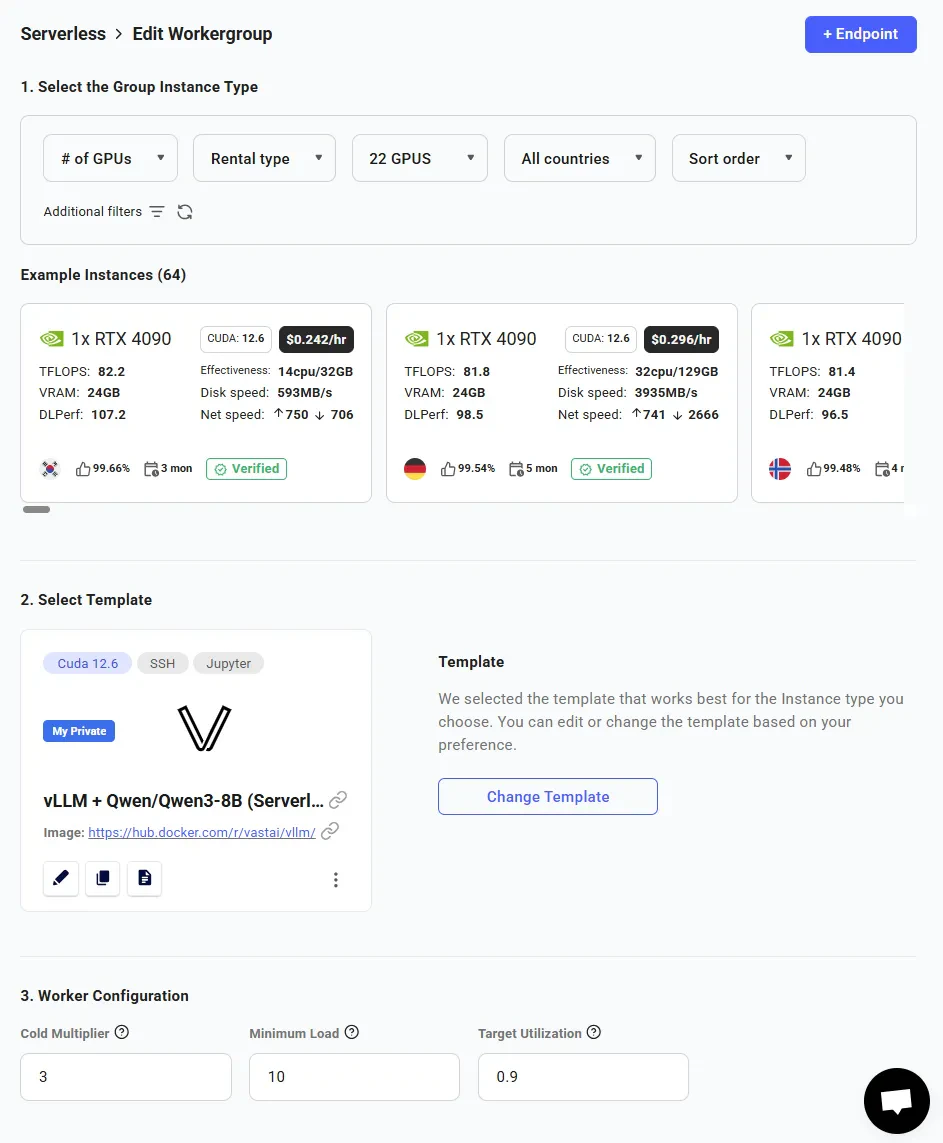 Now that we have our Endpoint, we can create a Workergroup with the template we prepared in step 1. Once the Workergroup is created, the serverless engine will automatically find offers and create instances. This may take ~10-60 seconds to find appropritate GPU workers.