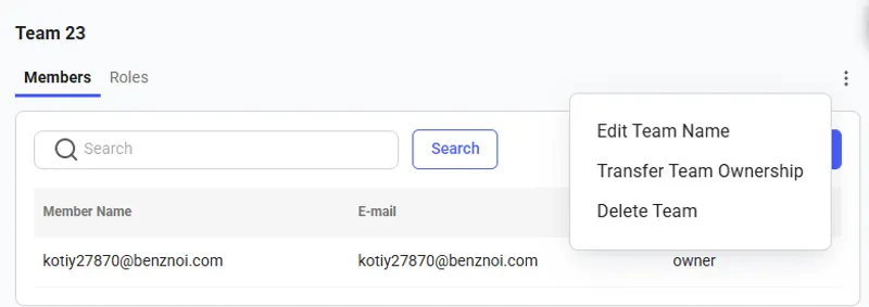 The Transfer Team Ownership feature allows an owner to seamlessly reassign the team to another member within it. To do so, navigate to the Members page and click the three-dot menu in the upper right corner.